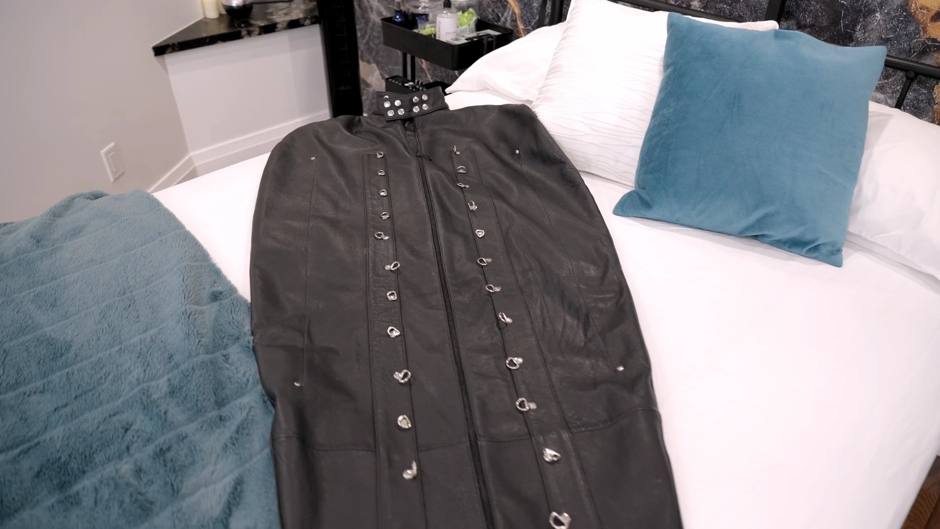 Разнообразная мужская кожаная одежда (стринги, ремни, одежда) - в корзине рядом с диваном
